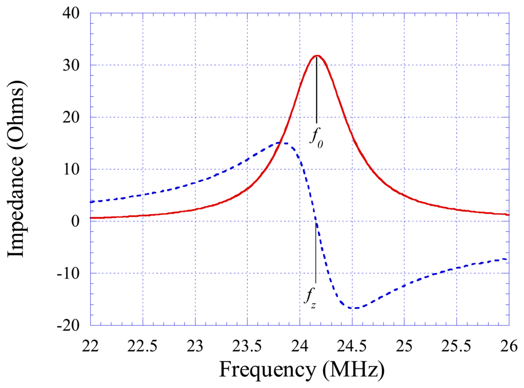 Referring to Fig. 4, the resonant frequency and zero-reactance frequency are related to the R, L and C values as given by [7]: