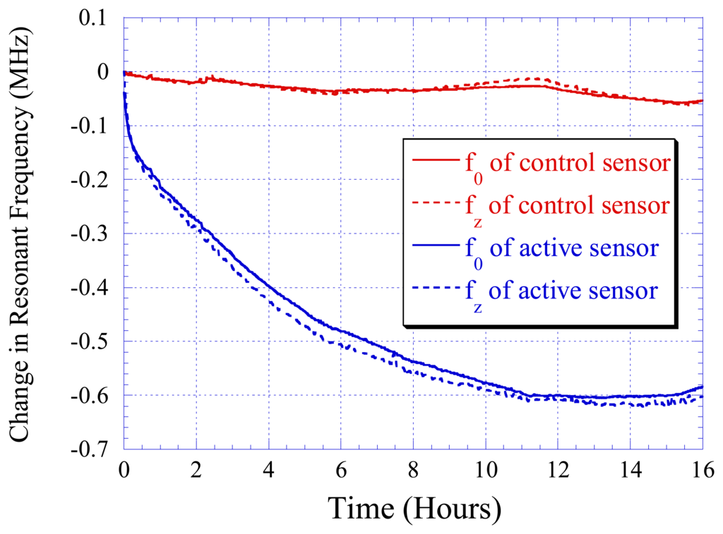 Fig. 8 shows the responses of the active and control sensors, which were embedded separately inside the opened and sealed Kellogg's Cocoa Krispies cereal packages. As shown in the figure, the response of the control sensor remained flat, while the resonant and zero-reactance frequencies of the active sensor had decreased. This indicated that the increase in capacitance was due to the water vapor adsorption on the paper substrate. The zero-reactance frequency was slightly lower, however, remaining close to the resonant frequency. This indicated that the absorption of water vapor to the sensor substrate increased the dielectric constant of the substrate but not the conductivity. Fig. 8 shows the response of the sensors in Kellogg's Frosted Flakes cereal packages. Similar to the previous experiment, the active sensor showed a continuous decrease in resonant and zero-reactance frequencies, while the response of the control sensor remained stable with respect to time.