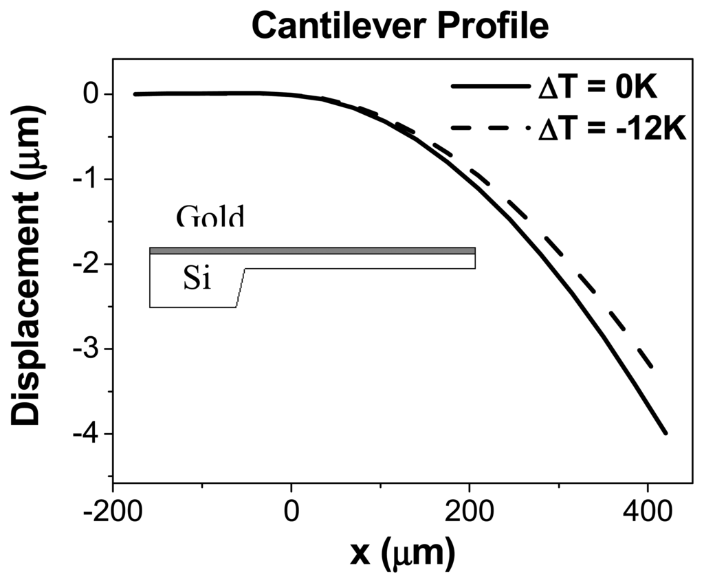The cantilever profiles for ΔT= 0K and ΔT=-12K are presented. The cantilever bends upwards when the temperature decreases. A schematic depiction of the cantilever is also shown to relate the sign of the cantilever bending to the orientation of the bimetallic cantilever. The profiles were obtained in medium vacuum (10-2Pa).