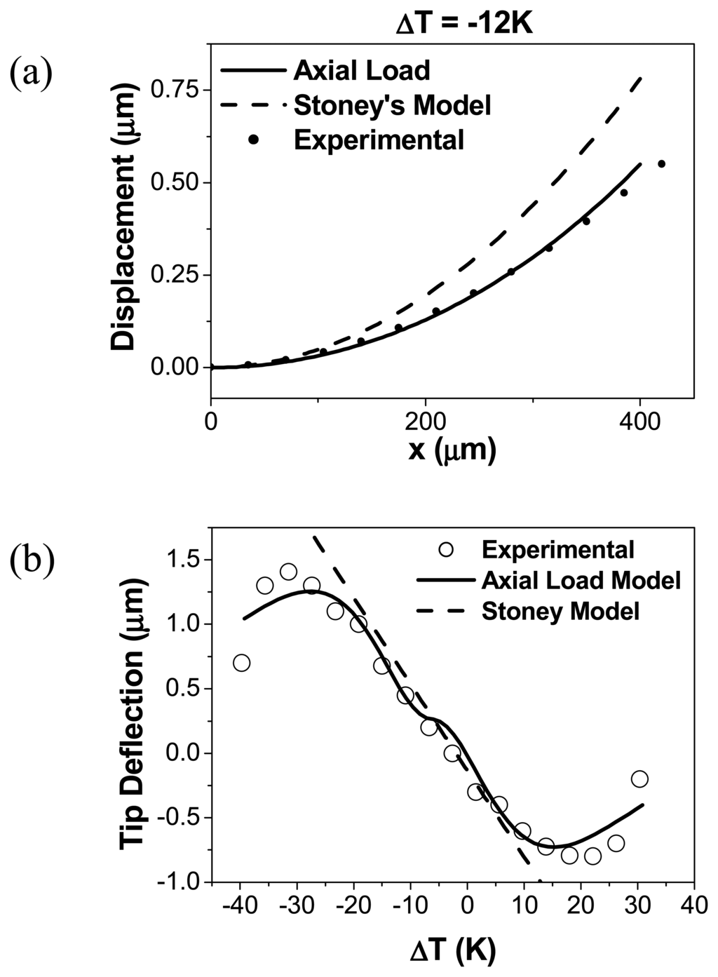 (a) Cantilever deformation predicted from the Stoney's model (dashed line) and the axial load model (solid line) for ΔT=-12 K. The two profiles are different in shape, as the axial load model does not show a complete parabolic behavior when temperature change. The experimental deflection profile fits with the axial load profile within a 10 % accuracy. (b) End tip deflection measured as function of ΔT. Theoretical value calculated from the Stoney's model (dashed line) and the axial load model (solid line) are added for comparison. The parameters used in this fitting are: Es = 169 GPa, Ef = 79 Gpa, αs = 2.59 10-6 K-1, αf = 14.2 10-6 K-1. The profiles were obtained in medium vacuum (10-2 Pa).
