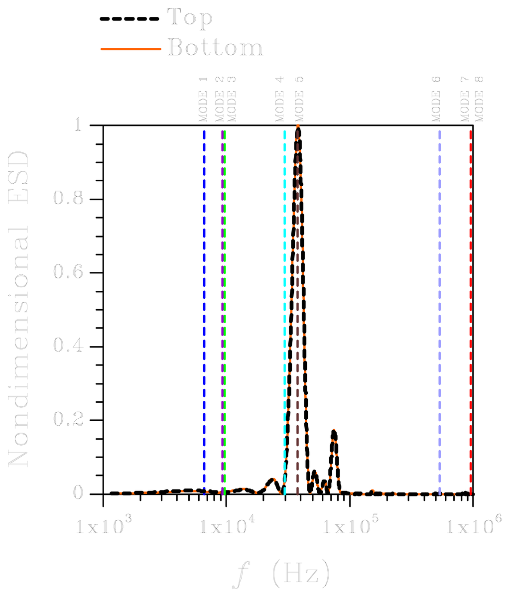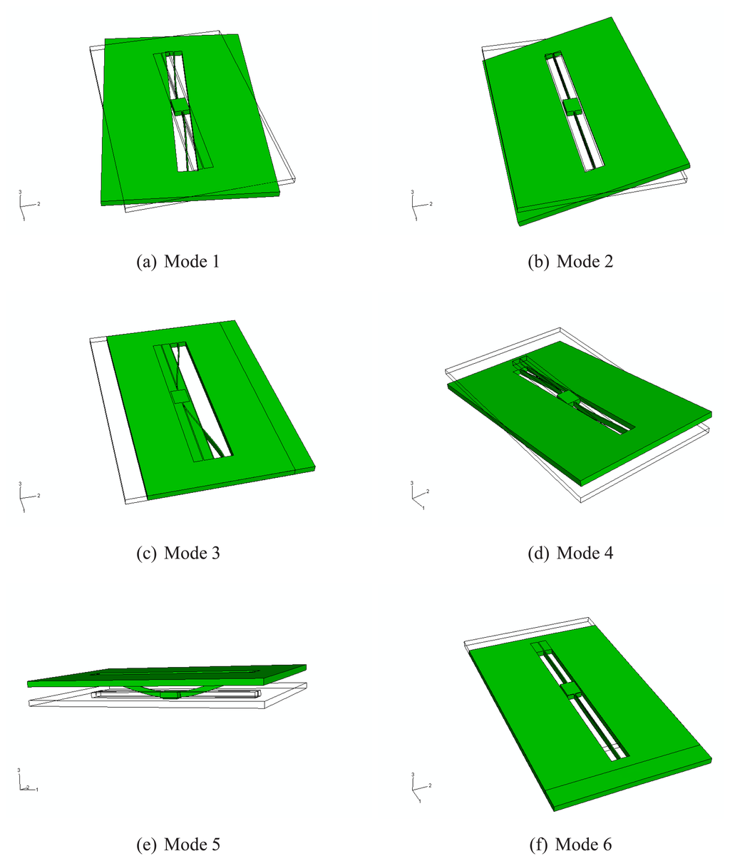 Figure 8 also shows that, even though the sensor falls perfectly horizontal in both the drop configurations, the asymmetric sensor lay-out (set to maximize the sensitivity to the acceleration along axis x3) lead to different relative movement records registered at points A and D, and at points B and C, thereby causing a coupled bending-torsional vibration of the springs. This is also shown by the Fourier transform of the maximum principal stress at the anchor point, see Figure 9: in the two drop configurations, the same peak in the excitation show up at a frequency corresponding to the fifth vibration mode of the sensor. Figure 10 collects the first six vibration modes of the sensor; here, obviously, the interaction between the sensor and the die has been disregarded to avoid nonlinear effects. As anticipated by plots in Figure 8, the fifth mode produces an out-of-plane bending of the springs coupled to longitudinal torsion.