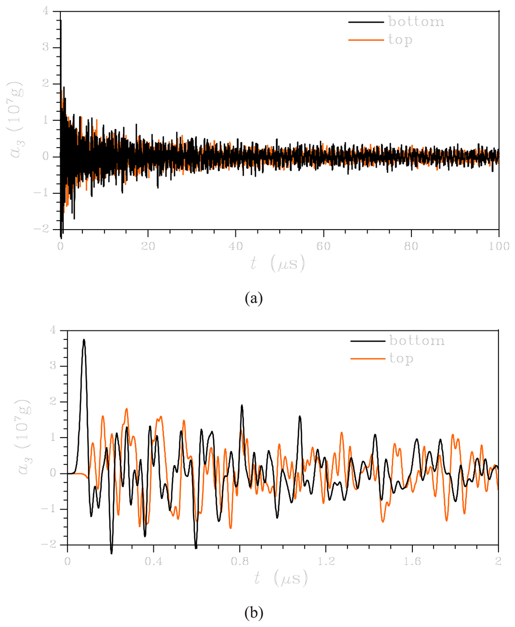 Comparison between top and bottom acceleration histories (a) in the full analysis range 0 < t < 100 μs and (b) in the short-time interval 0 < t < 2 μs after the impact.