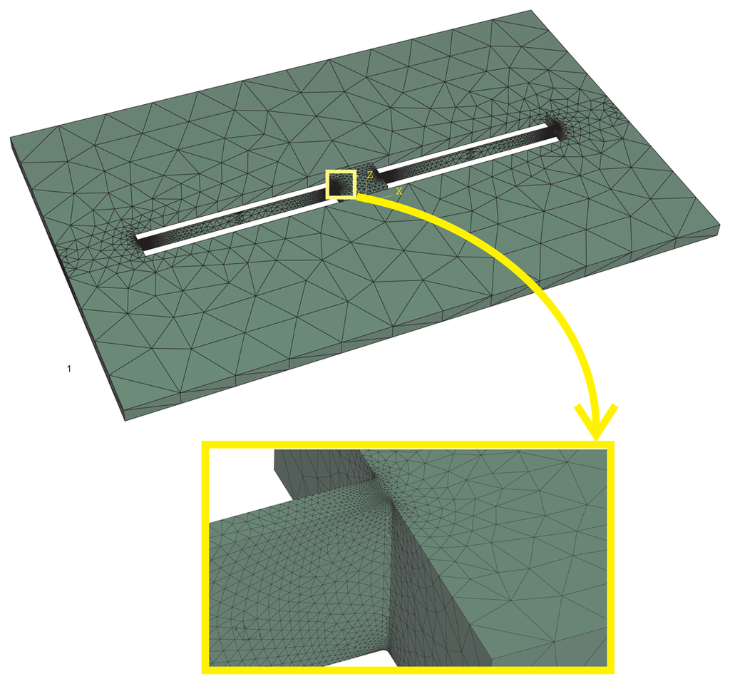 The geometry of the modelled device is shown in Figure 2: a space discretization consisting of about 145,000 tetrahedral, 4-node linear elements and about 30,000 nodes has been adopted.