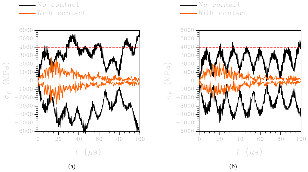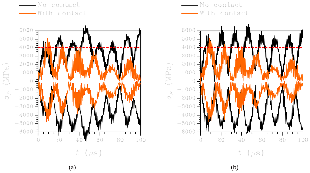 Figures 6 and 7 collect the envelopes of the principal stresses up to tend = 100 μs in the above mentioned joint sections, as caused by bottom and top impacts respectively. When contact between sensor and die is disregarded, it can be noticed that low frequency variations, with period Tlow ≈ 13 μs, are superposed to high frequency ones. These latter ones are linked to higher vibration modes of the springs, but they can be spurious artifacts of the simulations. When interaction between sensor and die is allowed for, vibrations turn out to be damped soon after the seismic mass strikes the die surface.