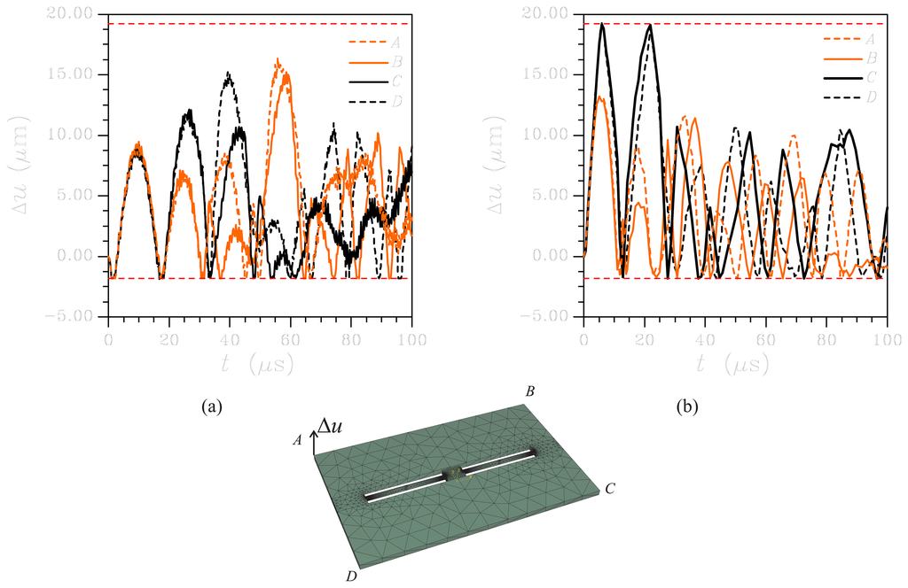 This is clearly evidenced in Figure 8, where the relative displacements between the plate corners and the die/cap surfaces along the direction perpendicular to the plate (sensing direction) are shown. In these plots, when the Δu curves match the horizontal dashed lines it means that the corresponding plate corner (according to the notation of Figure 8) and the top/bottom surfaces of the die cavity come into contact. In the bottom case (Figure 8a) the plate is pushed downwards after the impact by its inertia and the bottom surface of the die cavity is quickly approached: the deflection of the beam and, therefore, the stress field are reduced with respect to the case in which this interaction is disregarded. In the top case (Figure 8b), the sensor falls up-side down and impact against the target surface causes an upward motion of the seismic mass in the reference frame of Figure 2. Since the gap between the accelerometer and the bottom surface of the device cap is far greater that that between the accelerometer itself and the top surface of the die (as revealed by the ordinate of the horizontal lines in Figure 8), the springs suffer in this drop configuration a significant deflection before the interaction sensor-die takes place. This explains why in the top drop the stress field is higher and exceeds the tensile strength of the polysilicon, whereas in the bottom drop this limit is never approached.