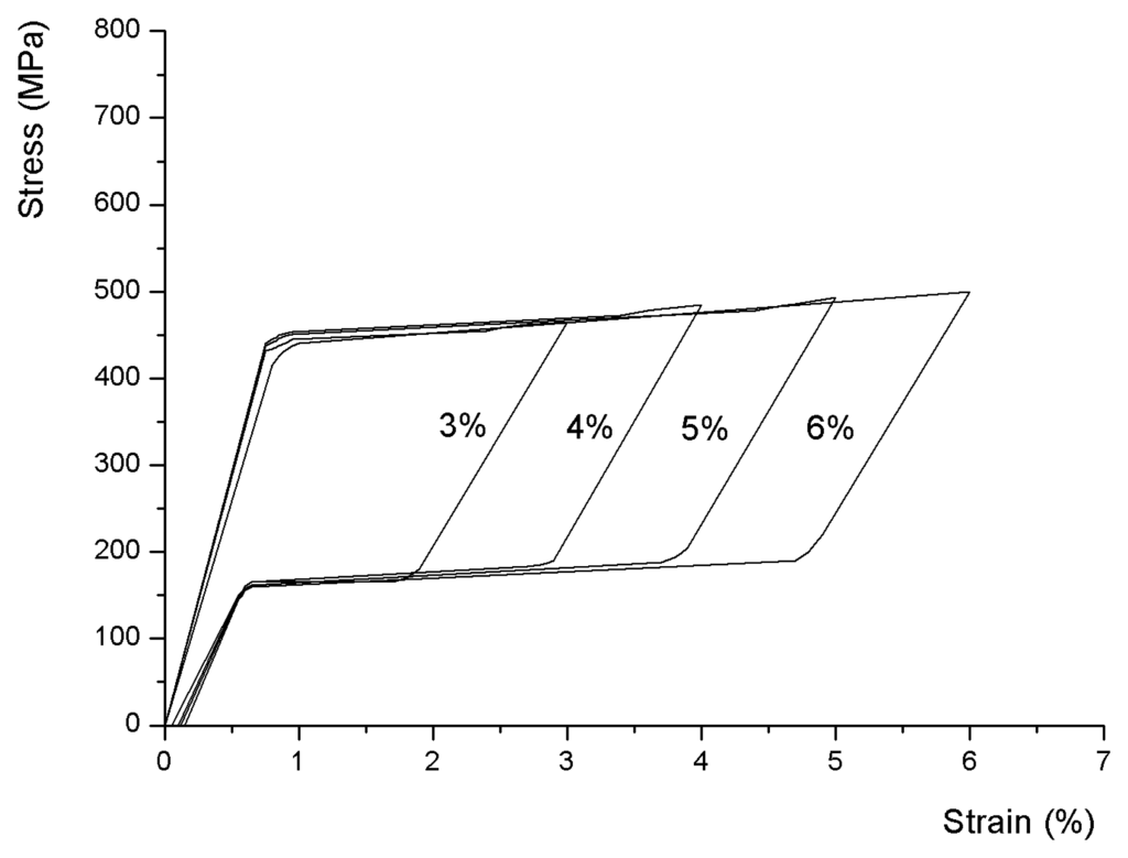 - Yawny, A.; Sade, M.; Eggeler, G. Pseudoelastic cycling of ultra-fine-grained NiTi shape-memory wires. Z. Metallkd. 2005, 96(6), 608–618. [Google Scholar]