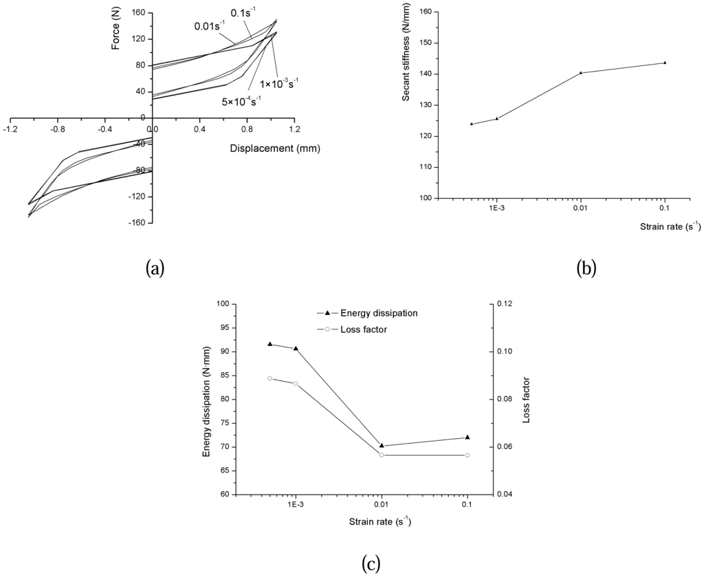 Figure 13 shows the mechanical behavior of damper subjected to different working strain rates. Unlike the force-displacement curve in low strain rate, the one in high strain rate exhibits narrow hysteresis loop, as shown in figure 13(a). Figure 13(b) shows the secant stiffness increases 16% when the working strain rate rises from 5×10-4s-1 to 0.1s-1. The dissipated energy, shown in figure 13(c), descends steeply up to 0.01s-1, whereas increases slightly from 0.01s-1 to 0.1s-1. However, the loss factor of the device decreases as the strain rate increases, though not significant as the strain rate is larger than 0.01s-1.