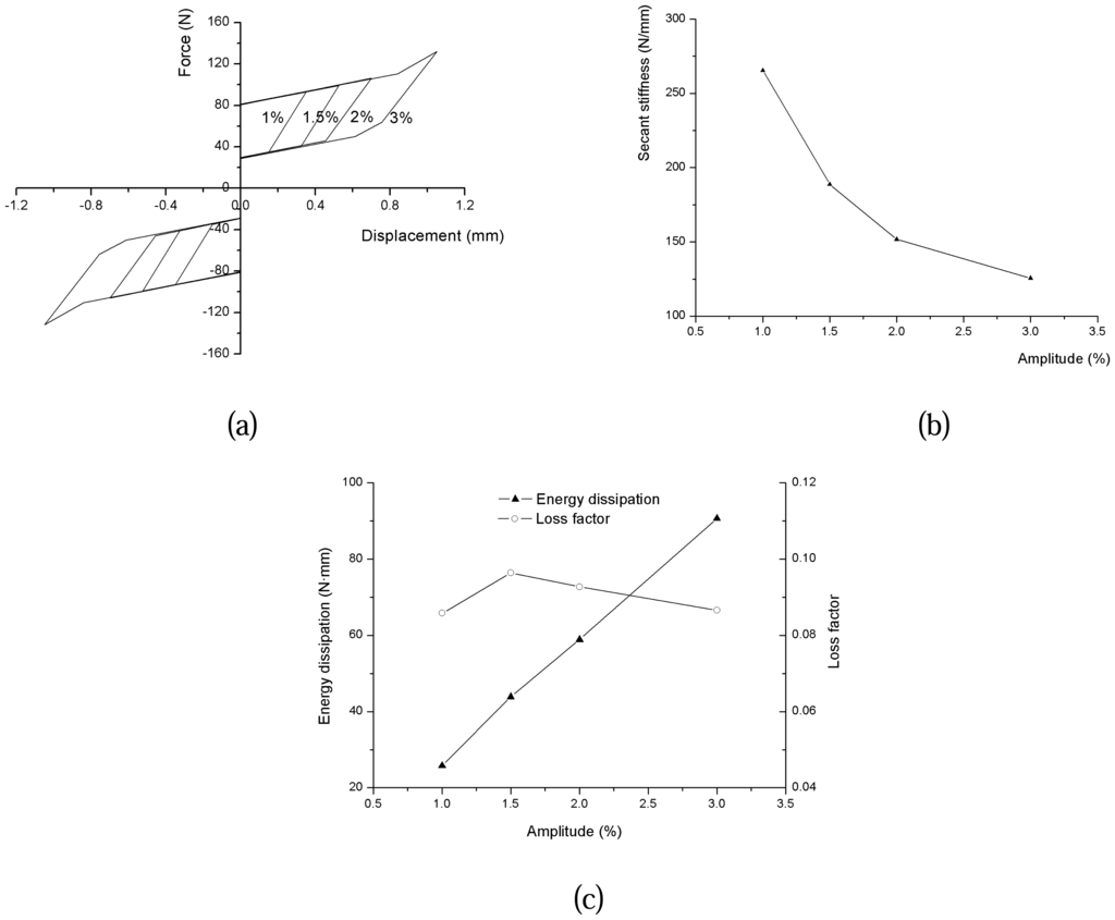 The schematic diagram of the hysteresis loops of SMA damper with different amplitudes, 1, 1.5, 2 and 3%, is shown in figure 14(a). To obtain enough stroke and high damping capacity as well, the NiTi wires are pre-tensioned with 3% strain. The result of figure 14(b) indicates the secant stiffness is significantly influenced by different amplitudes. The dissipated energy is observed to increase linearly associated with increasing amplitude. However, the loss factor of the damper is almost invariable with the variation of amplitudes.
