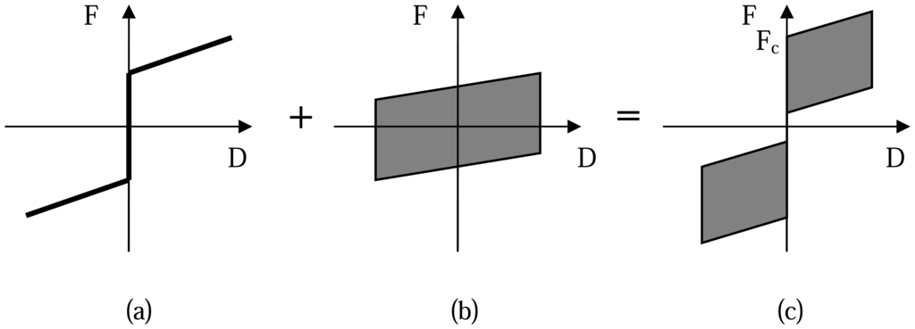 This SMA micro-damper model aims at high energy dissipation and complete deformation recovery ability as well. Nevertheless, these two targets are somewhat inconsistent because energy dissipation requires a hysteresis loop formed by force-displacement curve while the latter one can be satisfied by passing though the original point only. In order to realize it, Dolce's model [22] is adopted in this study, as shown in figure 2. However, it is observed the hysteresis loop of SMA schematically shown in figure 2(b) does not closely coincide with the behavior of energy dissipation element in Dolce's model. The maximum force increases with increasing displacement when the damper is pulled, while decreases when it is pushed.