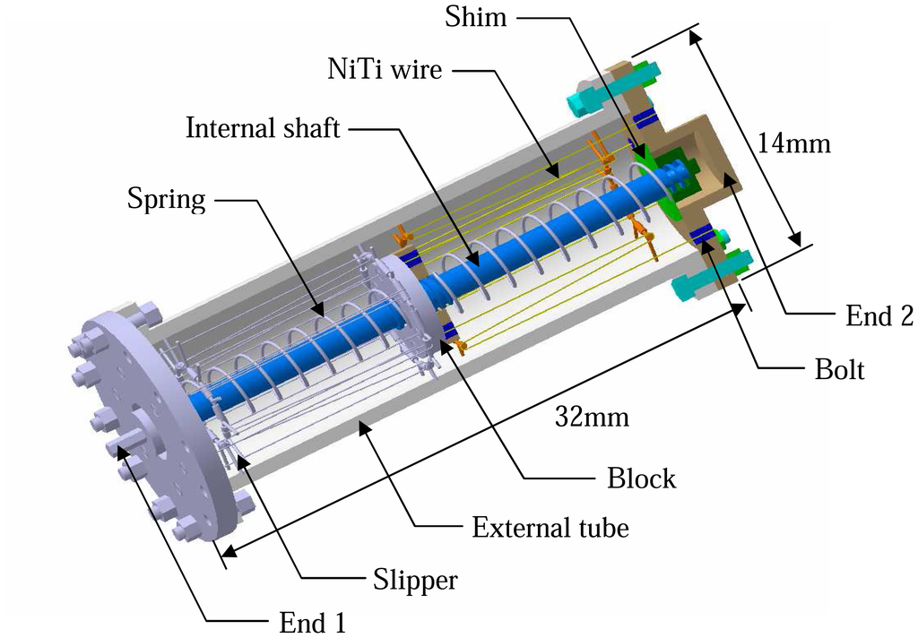 The prototype of conceptual SMA micro-damper is shown in figure 3. The main components of this damper consist of internal shaft, external tube, blocks, shims, springs, slippers and NiTi wires. The length of the damper is designed as 32mm and the diameter is 14mm for special study purpose here. The diameter of NiTi wires is 0.14mm and its free length is 35mm.