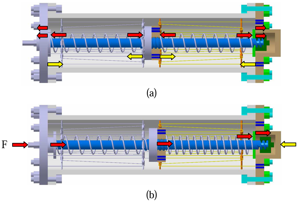 The initial configuration of micro-damper before loading is shown in figure 6(a). The NiTi wires are stretched by the block and the external tube. The reaction force to this compression of spring on one side of the spring is supplied by internal shaft via block, while it is provided by both shaft and tube on the other side. For better understanding, these behaviors are schematically indicated by the arrows in the figure.