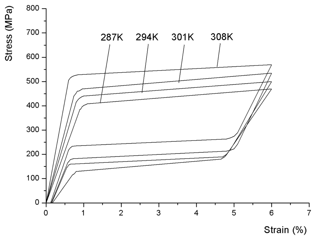 Observed from figure 8, the start transformation stress of martensite, i.e. the critical stress, occurs when the strain reaches 0.65-0.9% at different temperature and large hysteresis loops appear during whole loading-unloading process. Obviously, the increase of temperature causes the rise of transformation stress from austenite to martensite phase. Moreover, the area surrounded by hysteresis loop is not significantly changed with temperature, meaningfully denoting the dissipated energy may be considered as temperature independent during this temperature range. This phenomenon is considered to ascribe to the small size of the wire. Due to the thin diameter of wire, the heat generated by the applied loads may be dissipated very quickly; therefore the influence of temperature on energy dissipation is negligible.