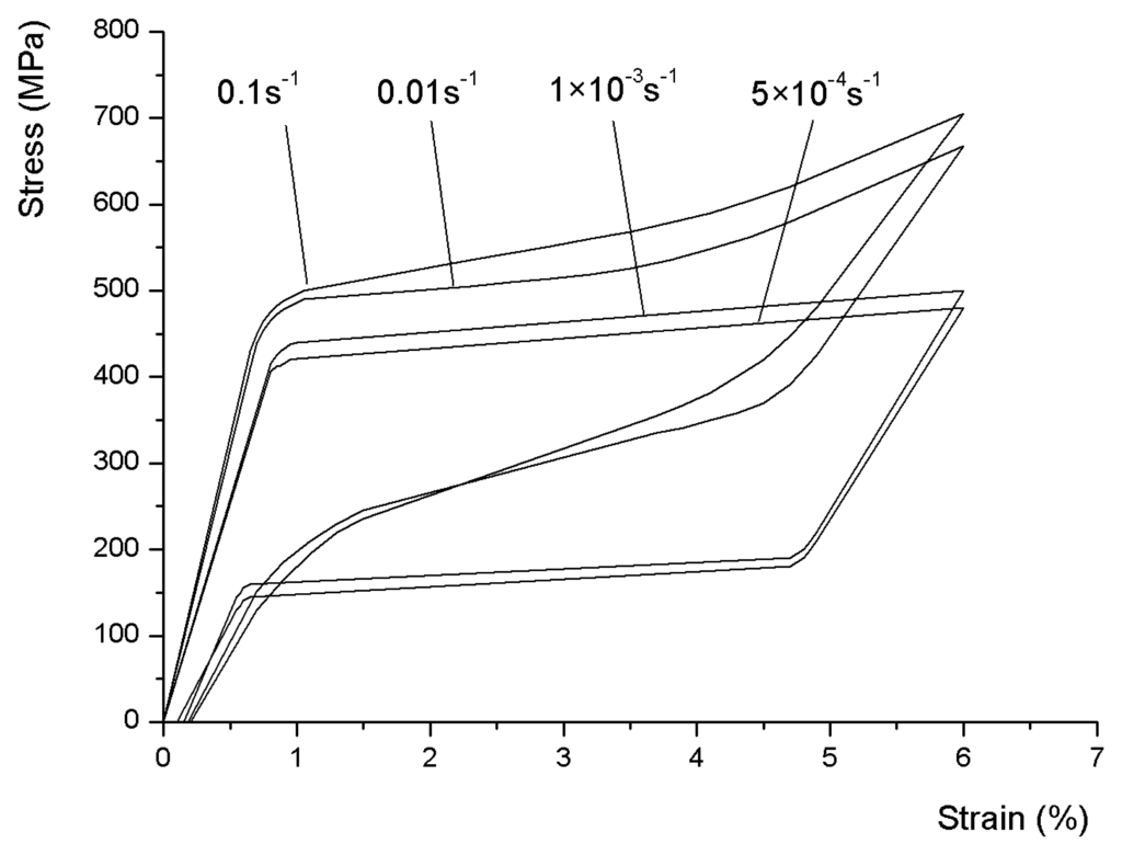 It is observed that the mechanical behavior of the wires changes significantly with the variation of strain rates. As can be seen, both upper and lower stress plateaus, which correspond to forward and reverse martensite transformation respectively, increase with increasing strain rates. In the viewpoint of energy, this behavior is ascribed to the heat exchange between wires and ambient air. When strain rate is low, the wire is acted by quasi-static tensile force; therefore the heat generated during loading-unloading process is able to be dissipated immediately. Nevertheless, high strain rate causes the reduction of dissipated heat in unit time, leading to the accumulation of the heat. Hence the instantaneous temperature of wire is higher than isothermal, resulting in the rise of the upper and lower stress plateaus.
