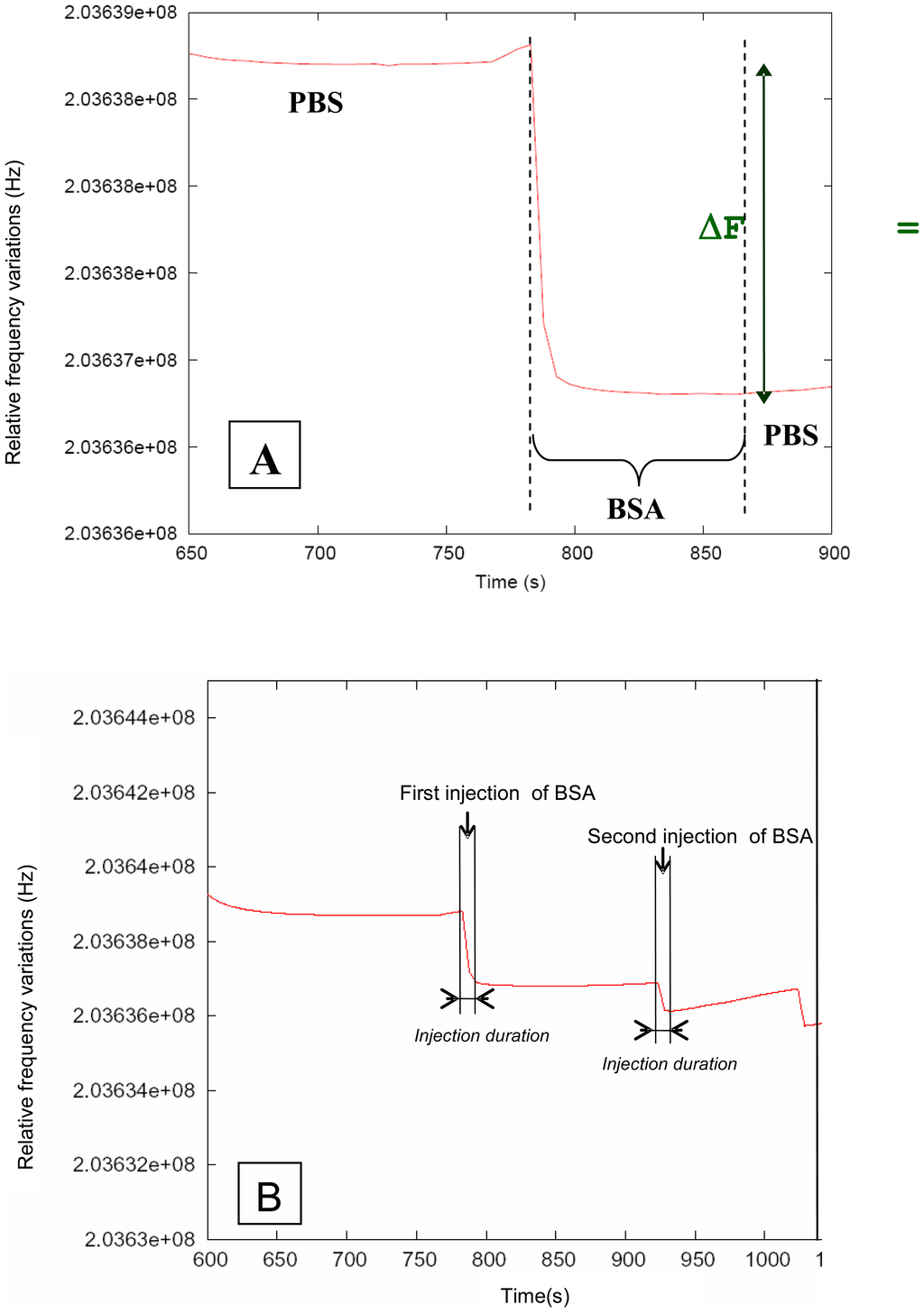 Sensor response for BSA solution 0.1wt% in saline buffer. A: Single injection, the variation of frequency (ΔF) corresponds to BSA physisorption process on the sensor surface, B: Manifold injections.