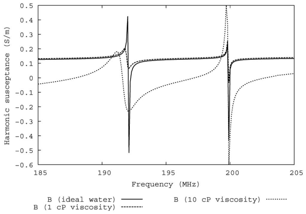 As predicted by theoretical models, frequency shifts relative to viscosity changes of the tested liquid do not follow a linear law. It is proved that the viscosity can be reliability detected using our sensor, but it is also possible to reject its influence either by a real time direct differential process or by simply retrieve its contribution to the obtained frequency shifts using an adequate post-process. By this way, it is possible to extract specific signals of bio-molecular adsorption processes onto the sensing area.