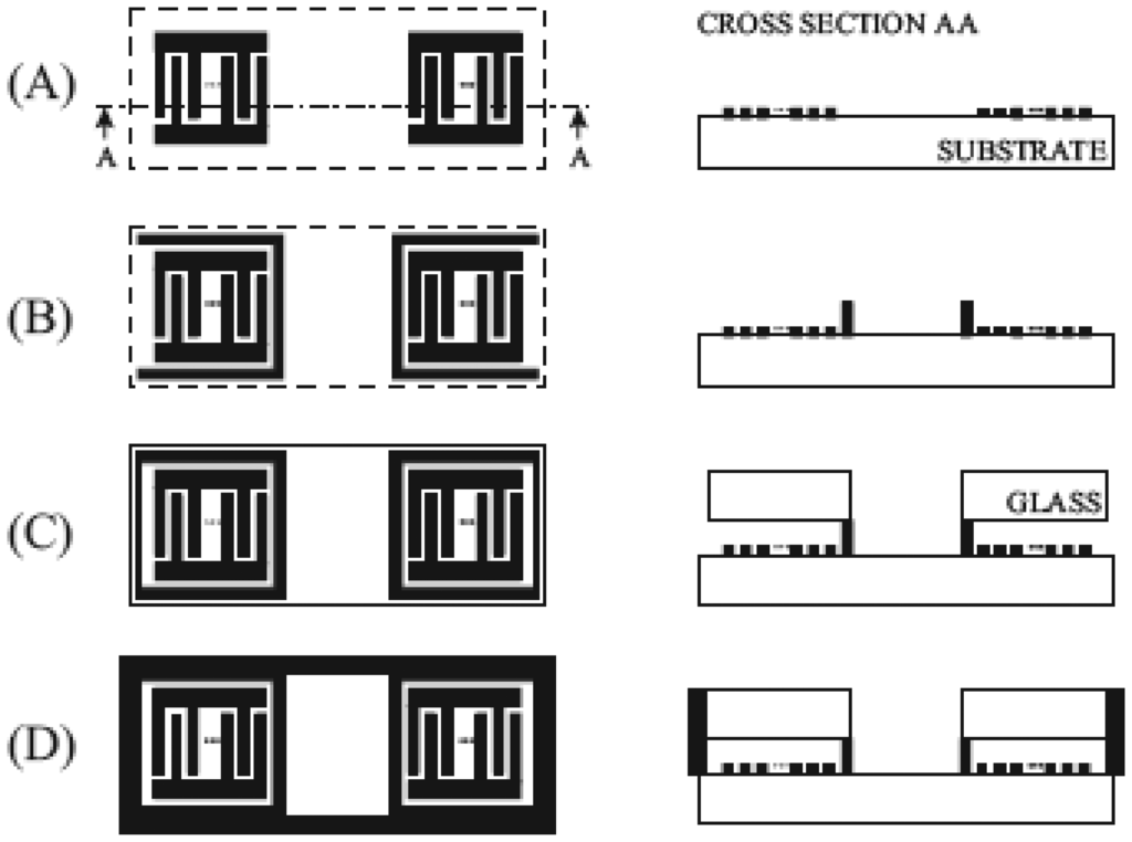 Simplified flow chart of the fabrication process. The left side corresponds to a top view of the device and the right side to its cross section. (A) Initial SAW consisting of aluminum electrodes deposited on the quartz substrate. (B) SU-8™ walls are patterned partly around the transducers and the wafer is diced to release each sensor. (C) The sensor is attached to the printed circuit board. The contact pads are wired and the top side of the SU-8™ walls is manually covered with epoxy glue, followed by the bonding of the glass cap. (D) The left parts are filled with the same epoxy glue to seal the device. A PDMS cover is finally glued by oxygen plasma onto the glass cover. This allows for supplying liquid in the sensing area using needles. The liquid cell defines a well of precise dimensions above the sensing area of the packaged sensor.