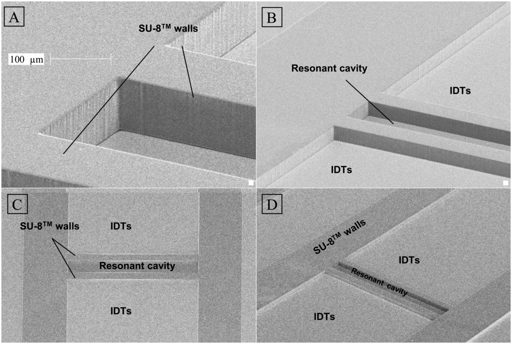 Figure 5 shows scanning electron microscope (SEM) images of the SU-8™ walls. A protective glass cap with openings is later bonded above the resonant cavities to supply the device with liquids. Finally, a PDMS cover is glued above the glass cap to deliver liquids within the sensing area using needles and catheters. The whole cell (SU-8™quartz/PDMS) is accurately located atop the sensing area. Final dimensions of the sensing area are 3000 μm (length,) times 300 μm (width), and the height is 965 μm (taking the PDMS cover into account), which represents a volume cavity of about one μliter.