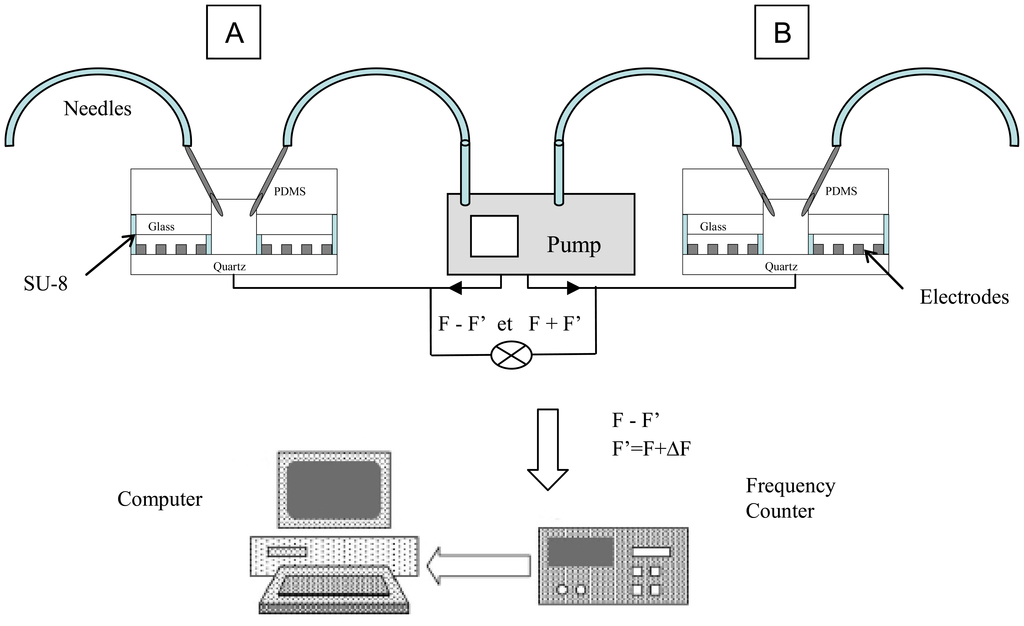 Diagram of the differential flowing system for the sensor measurements in liquid phase with two identical resonators, a pump to transport liquid and a system to analyzed frequency variations. (A) is a reference device operating in water and (B), the sensor, is used for detection.