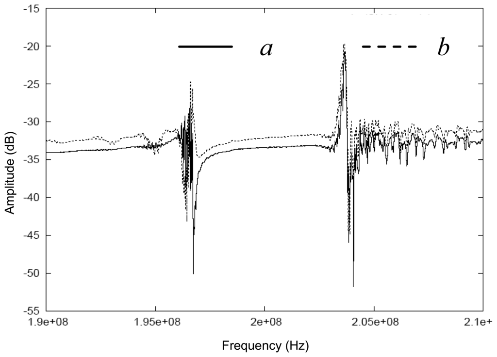 Superimposition of frequency responses of the SAW sensor in air (a) and in liquid (b).