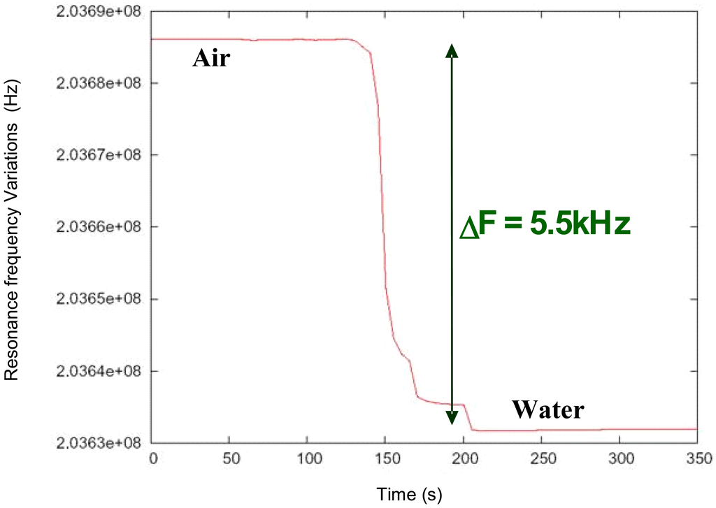 As shown in figure 9, one can see that the sensor resonance frequency is shifted down as expected theoretically. Frequency shifts equal to 100 Hz and 250 Hz have been found when changing the viscosity from 1 cP to 6 cP and from 1 cP to 23 cP respectively. The sensor exhibits (i) a good stability in frequency in de-ionized water and (ii) a high capability to detect the effect of the viscosity, which appears to be quite small (much smaller than 1 ppm per cP). These experimental measurements give us a good confidence in the robustness of device operation exposed to various concentrations of viscous organics.