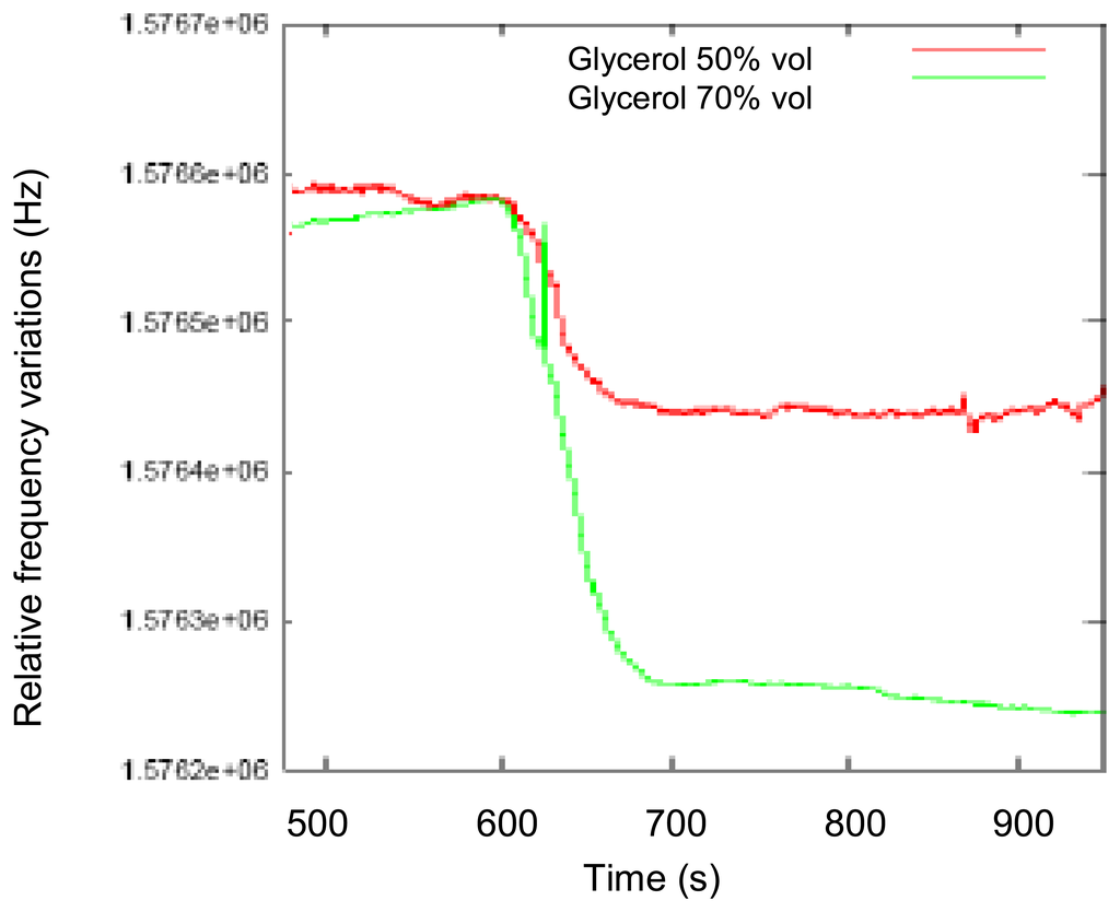 Preliminary experiments have been performed to evaluate the efficiency of the liquid cell and to check the Love-wave signal dynamics when loaded with fluids. Figure 7a represents the transfer function of a Love-wave-based Silica/Quartz resonator in air and in water with the above-described system. As theoretically predicted, a second resonant contribution arises, corresponding to the end of the frequency stop band of the resonator. Results under controlled liquid flow are reported in figure 7b showing the vanishing of the resonance at the beginning of the stop band at 200 MHz and the persistence of the end-of-stop band resonance at 204 MHz, as theoretically expected. The preservation of this property allows for the use of the device supplied with water, as proven by experimental measurements. The frequency shift between air and water conditions is close to 5.5 kHz (figure 8). We also have performed viscosity measurements of aqueous and biological media. Figure 9 illustrates the capability of the sensor to discriminate various concentrations of glycerol in aqueous media. 50 and 70% of glycerol solutions (by volume) with values of viscosity of 6 and 23 cP respectively have been tested at room temperature, giving clear shifts in frequency allowing viscosity discriminations in aqueous media.
