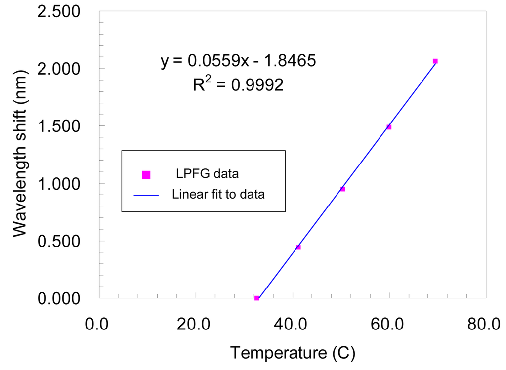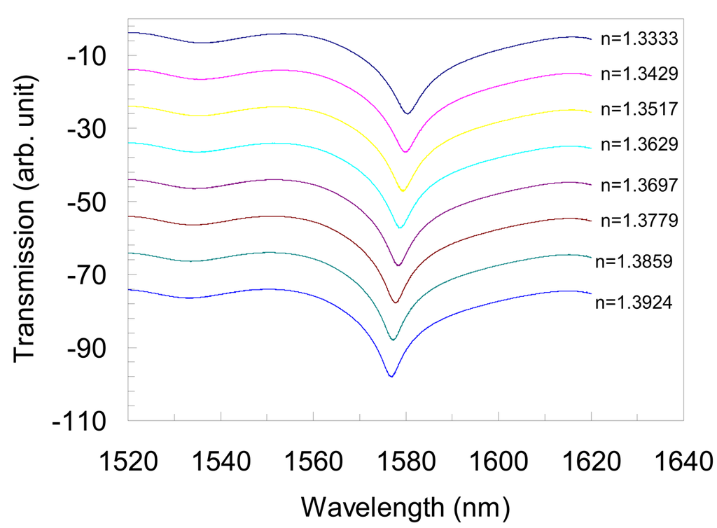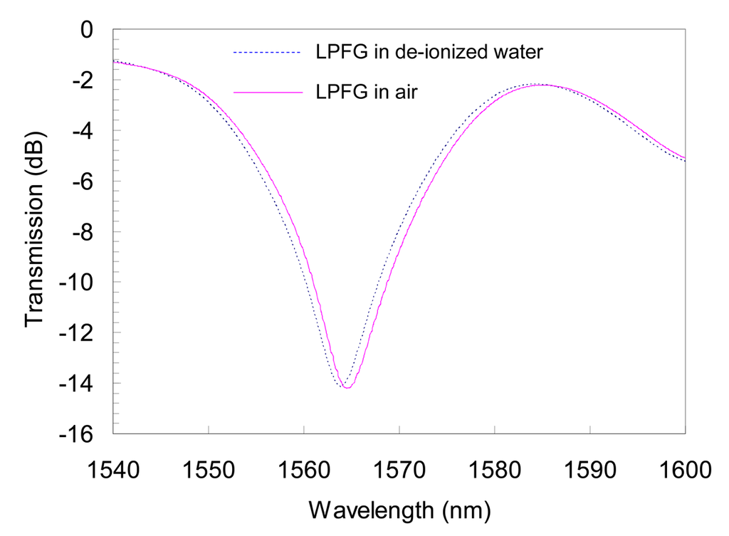 changes and a wavelength shift can be obtained in the transmission spectrum. The wavelength shift can be linearly related to the concentrations of the solution under test. An LPFG can be very sensitive to the changes in temperature and deformations by fiber imperfections, loading, and bending, which also produce a noticeable wavelength shift in loss peaks. Therefore, to precisely measure variations of concentrations or RI changes, temperature changes and deformations must be compensated or avoided.