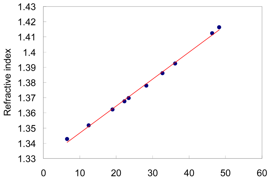 In the experiment the strain sensitivity of all LPFG gratings used in this work were very small (∼0.13 pm/με) and they exhibited nearly insensitive to strain variations. For temperature variations of 1°C, the temperature-induced wavelength shift of 0.06 nm was larger than that spectral resolution of 0.02 nm used in our spectrum analyzer. For precise measurement, experimental setup and sample solution were kept at the same temperature (within 0.1°C). During the course of measurement the fiber was maintained straight to avoid any deformation induced on the LPFG. Therefore, the results reported here were not influenced by both temperature and strain effects. To illustrate the application of an LPFG as a RI sensor of a concentration sensor, measurements with sucrose and sodium chloride aqueous solutions were performed. The surrounding RI was controlled through the use of sucrose solutions with various concentrations. As shown in Fig. 10, the relationship between RI and sucrose concentration has been determined and shown to be linear []. Experimental results for both solutions show that the LPFG-based sensors exhibited a linear decrease in the transmission loss and resonance wavelength shift when the concentration increased, demonstrating that the LPFG and CMAuLPFG gratings are suitable for chemical sensing.