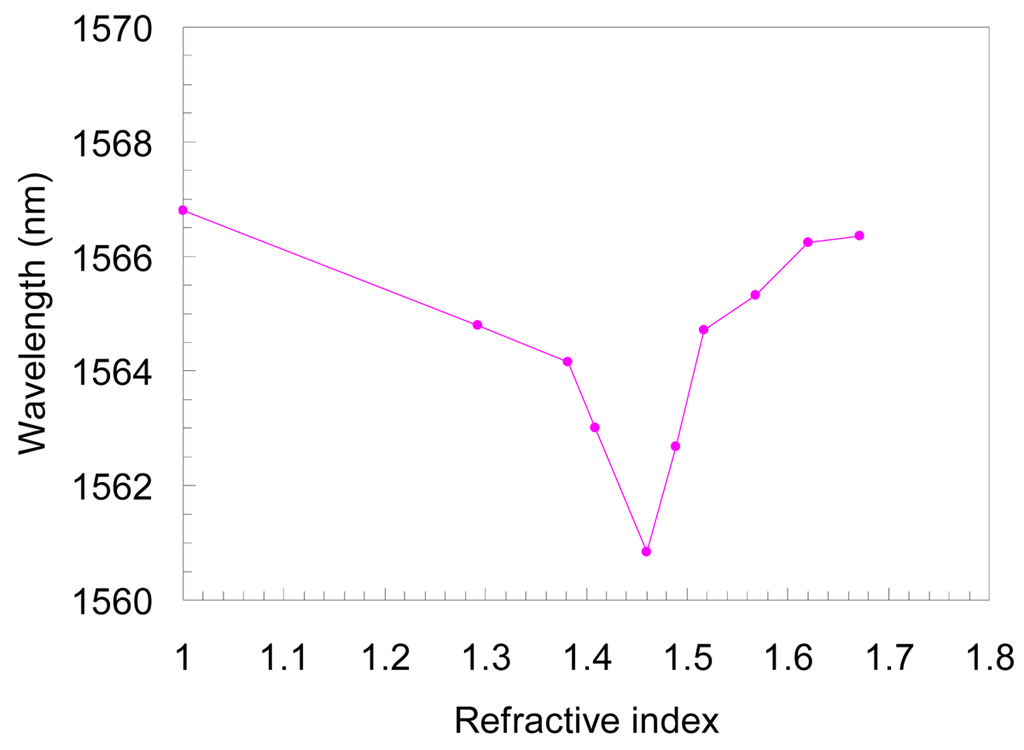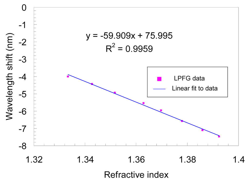 is relevant to each of the measurands and contributes to effective wavelength change of the mth cladding mode. The RI sensitivity of an LPFG arises from the dependence of the resonance wavelength on the effective RI of cladding mode, which also is dependent on the RI of the surrounding materials. The LPFG is expected to have a strong dependence on the order of the coupled cladding mode since for each cladding mode
