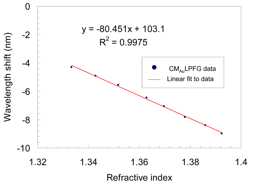 The experimental set-up to measure spectral sensitivity of this sensor for chemical sensing is adopted from Ref. , which includes a broadband light source, a sensing LPFG fiber, a cell, and an optical spectrum analyzer. The LPFG sensor was immersed in different media such as air, water and sucrose solutions and its transmission spectrum was measured with the optical spectrum analyzer. Each transmission spectrum was referenced to the background spectrum of a bare fiber in air. In this work, a number of LPFGs and CMAuLPFGs grating sensors associated with various attenuation bands were measured and investigated.