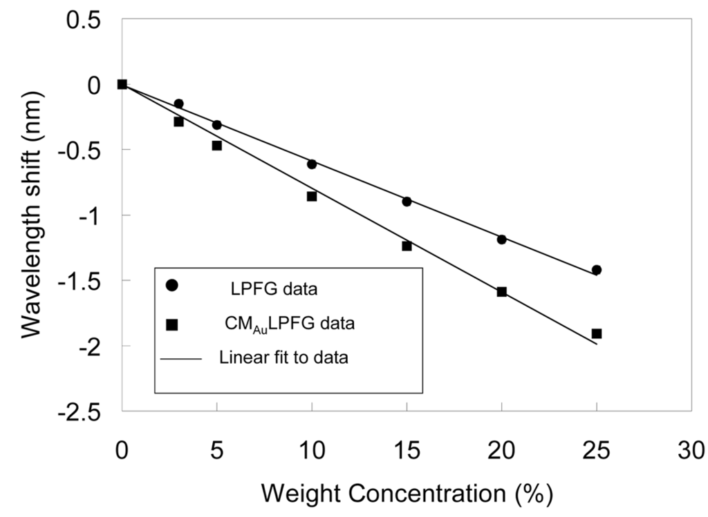 Wavelength shift of a CMAuLPFG sensor with increasing concentration of sucrose in aqueous solution.
