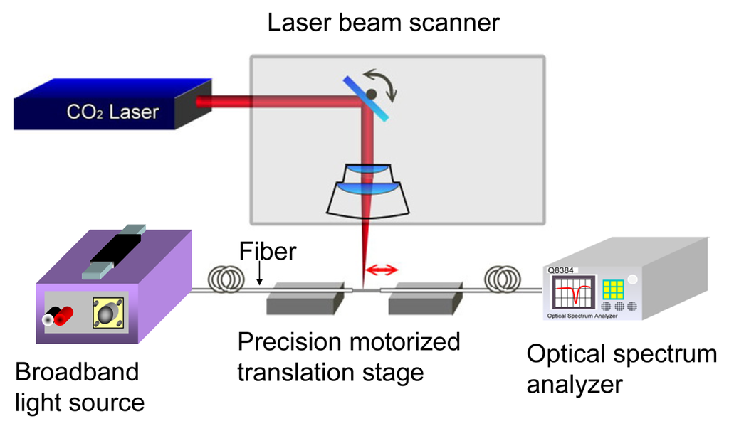 The LPFGs used in this experiment were fabricated in a single-mode fiber using a high-frequ ncy CO2 laser system through the point-to-point technique, a simple and highly controllable method for inducing periodic index changes on a bare fiber [, ]. The experimental setup is shown in Fig. 3, which is consisted of a computer-controlled CO2 laser (SYNRAD 48-2, 25 W full power) associated with a high-speed laser beam scanner, a fiber holder, a broadband light source, and an optical spectrum analyzer. A translation stage is used to position the fiber in the alignment fixture. The beam scanner is constructed by a galvanometer mirror and F-theta lenses, which moves the focused laser bean with a 290 μm beam spot across a field size of 110 mm. The two-beam position resolution of the system is about 30 μm and the maximum speed of moving successive beam pairs could be up to 40 kHz (25 μs). A broadband light source (600-1700 nm) and a high-resolution spectrum analyzer are employed to in-situ analyze the transmission loss as the grating was written.