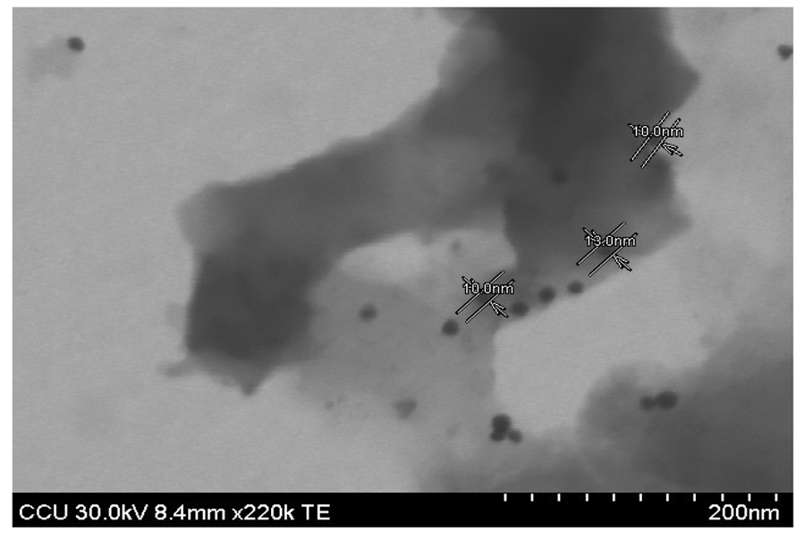 Here, the procedure for preparation of gold colloids has been reported elsewhere [-]. Transmission electron microscopic (TEM) image analysis (Fig. 4) shows that the mean diameter of the gold colloids was 8.4 ± 2.8 nm. The average surface coverage (relative to a close-packed monolayer) of a self-assembled colloid monolayer of gold (CMAu) was estimated to be 30% by atomic absorption spectroscopy. The self-assembled CMAu's on glass substrate were characterized by UV-vis spectrophotometry. We have optimized the process time of self-assembled for gold colloids on glass substrate to obtain a reasonable absorbance for further applications. Fig. 5 is the absorption spectrum of CMAu's on glass prepared by three different self-assembled time, which are 20 min, 23 min and 25 min, respectively. The self-assembled time of 23 min was chosen for it achieved the maximum absorbance. The preparation of colloidal Au-modified long-period fiber gratings (or CMAuLFPG) [] is adopted from the same procedure as that of the colloidal Au-modified optical fibers (CMAuOF) in Ref. . Since the fiber used in this study is an optical fiber whose core and cladding are made of silica glass, one would expect that, when the concentration of surrounding medium changed, self-assembled CMAu's on glass substrate will exhibit similar behavior such as LSPR maximum and absorbance changes as compared to those self-assembled CMAu's on the cladding portion of a fiber. Furthermore, both LSPR maximum and absorbance changes depend on the mean size and density of our gold colloids monolayer, which can be controlled by controlling formation conditions of gold colloids such as temperature, time and the concentration of the solution. Previous publication as in Ref. has shown that the particle density of gold colloids monolayer and, hence, the mean diameter and absorption of the gold colloids, can be controlled by varying the immersion time (or self-assembled time) in the colloidal gold suspension. Hence, here one can adopt the analogous reasoning to our LPFG test samples in determining the optimized mean diameter and absorption of the gold colloids through controlling the self-assembled time. A self-assembled colloid monolayer of gold on the grating surfaces of LPFG was used for further study.
