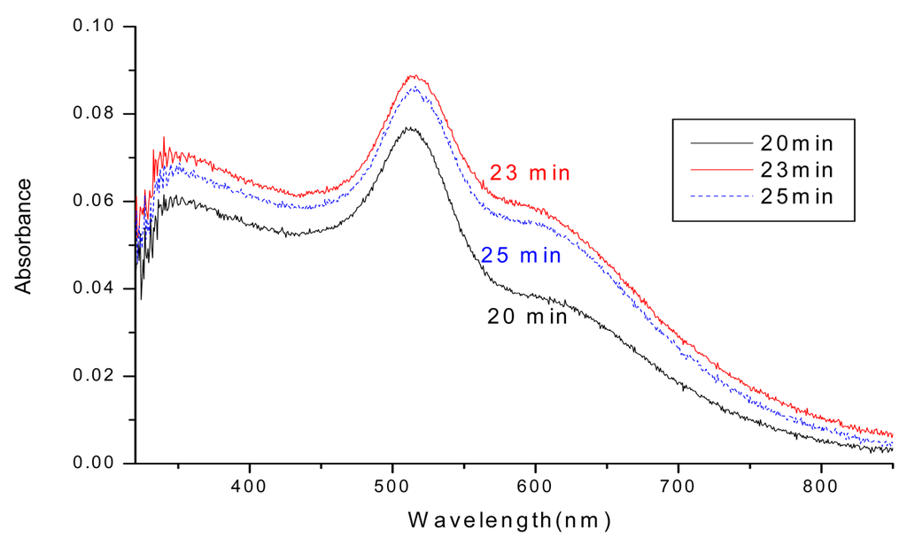 Absorption spectrum of CMAu's on glass substrate with three different self-assembled time.