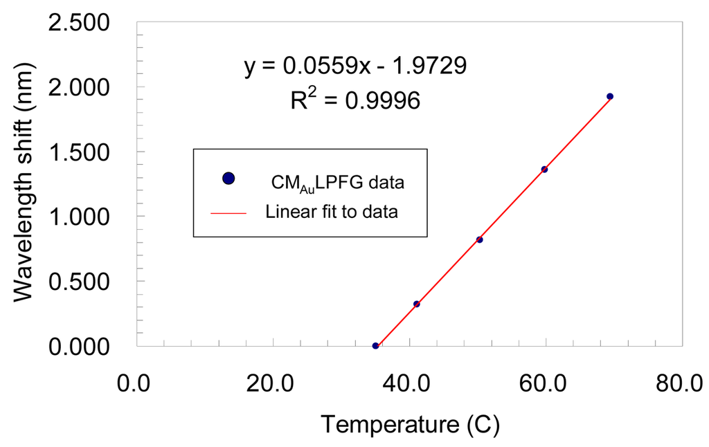 Wavelength shifts of the CMAuLPFG versus temperature.