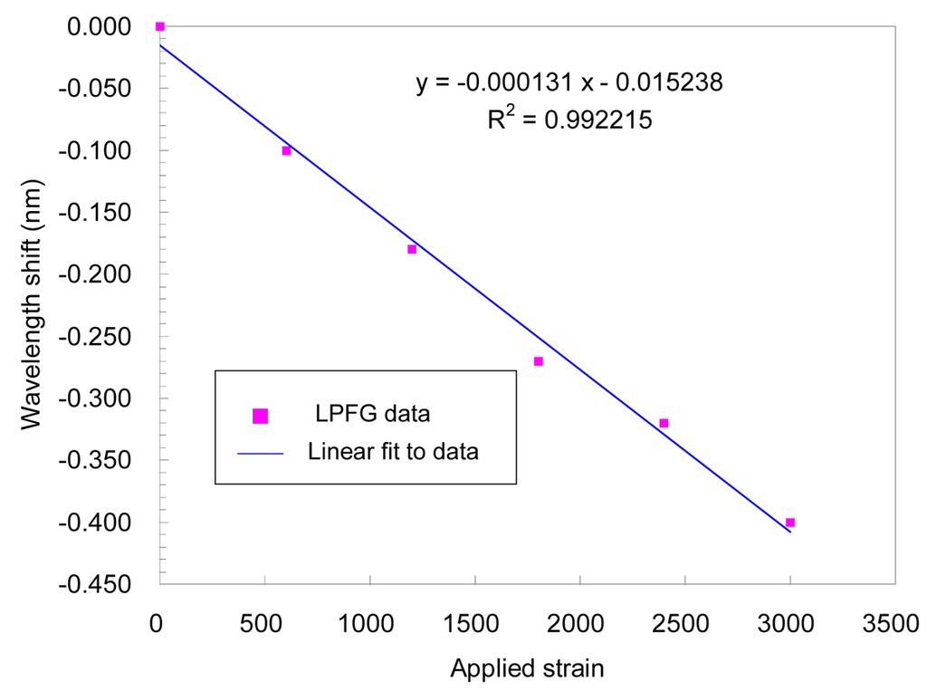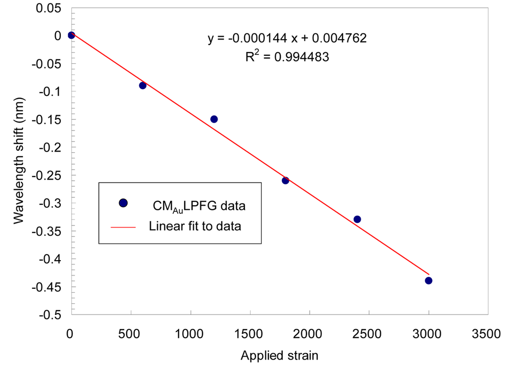 Strain-induced wavelength responses of LPFGs were found to be more dependent on the type of fiber. In particular, gratings written in Furukawa or Corning fibers exhibited nearly insensitive to strain variations. The strain sensitivity of the LPFG was determined by measuring the wavelength shift of the attenuation bands as a function of strain applied to the fiber, which was performed by mounting the grating on a translation stage that was moved outward to induce a strain in the optical fiber. The results for an LPFG and a CMAuLPFG are shown in Figs. 8 and 9, respectively, which are approximately ∼0.13 pm/με and ∼0.14 pm/με, respectively, indicating that strain sensitivity of the LPFG is unaltered by the influence of the presence of gold colloids applied on the grating surface. It can be seen that both temperature and strain sensitivities of the LPFG were not influence by the presence of a monolayer of gold colloids on grating region.