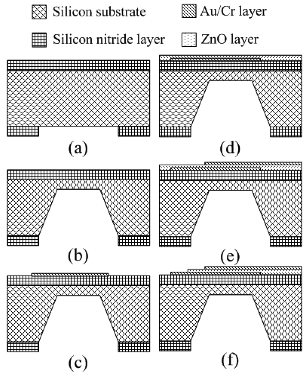Figure 1 shows the fabrication process of the proposed ZnO pyroelectric sensor. A double-side polished p-type (100) silicon wafer is adopted as the substrate. Silicon nitride layers of thickness of 1 μm are deposited onto both sides of the substrate by LPCVD to obstruct the thermal conduction to the substrate, which can increase the pyroelectric signal and responsivity of the sensing element. Then photolithography and reactive ion etching (RIE) are used to pattern the etch window at the bottom side of the substrate, as shown in Figure 1(a). Subsequently, the KOH solution of 45 wt% is used to etch the substrate until the remaining thickness is about 50 μm. The etching temperature is kept at 75 oC. Therefore, a cavity shown in Figure 1(b) is formed at the bottom side of the substrate to reduce or block the thermal loss from the ZnO layer to the substrate and ambient.