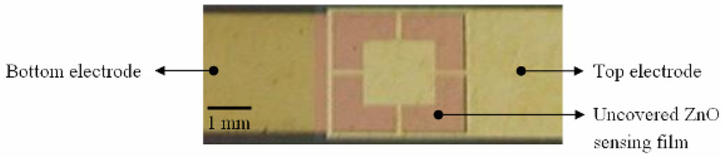 The pyroelectric sensing element is consisted of a ZnO sensing layer sandwiched in between the bottom and top electrodes, and is accomplished on the top-side of the substrate. The bottom and top electrodes are both composed of gold and chromium. The chromium is an adhesion layer to promote the adhesion between the gold electrode and the substrate or ZnO. The thicknesses of gold and chromium are 100 nm and 10 nm, respectively. In the step shown in Figure 1(c), e-beam evaporation is used to deposit the bottom electrode and then patterned by wet etching. After the bottom electrode metallization, the ZnO layer of a thickness of 600 nm is deposited by RF magnetron sputtering, as shown in Figure 1(d). A ZnO target with 99.99% purity is adopted. The ZnO target is pre-sputtered for 15 minutes prior to the film deposition to remove any surface impurity. The chamber is pumped with base pressure up to 8×10-7 Torr before sputtering. The chamber is then filled with the mixture of argon and oxygen with the gas-mixing ratio of 5:3. The chamber pressure is 2×10-3 Torr while deposition. The substrate is heated up to 200°C while deposition, which can help to make better ZnO film quality. In the step of Figure 1(e), the fabrication of the top electrode is similar to that of the bottom electrode except that the top electrode is patterned by lift-off. Finally, the ZnO layer is etched to expose the bonding pad of the bottom electrode, as shown in Figure 1(f). The recipe of the etching solution is CH3COOH: H3PO4: H2O=1: 1: 10. Figure 2 shows the finished ZnO pyroelectric sensor.