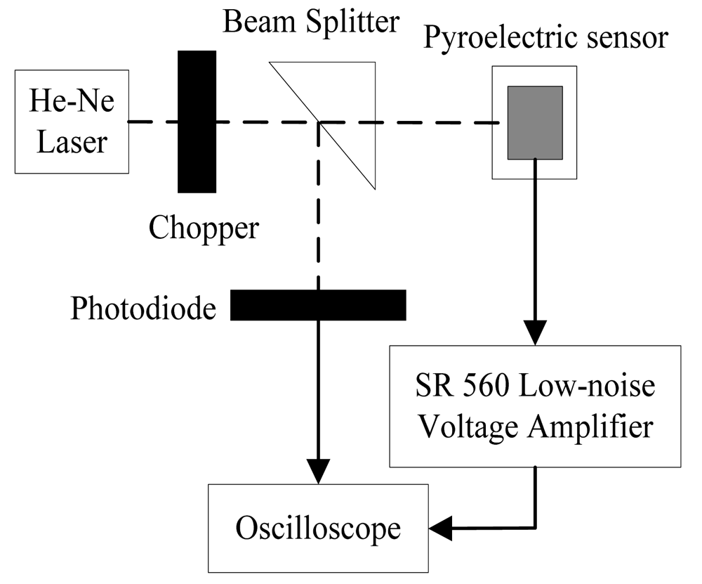 Figure 3 shows the schematic of the responsivity measurement of the proposed ZnO pyroelectric sensor. The radiation source is a calibrated He-Ne laser with 633 nm wavelength and 1mW maximum power. The laser beam is chopped at a modulated frequency (ω). The modulated beam is split into two beams by a prism. One is reflected on a photodiode as the reference, and the other one is defocused such that the beam spot can cover the whole top electrode of the ZnO pyroelectric sensor. The output voltage of the sensor is amplified by the SR560 low-noise voltage amplifier. Both the output signals of the sensor and the photodiode are recorded and displayed by a digital oscilloscope.