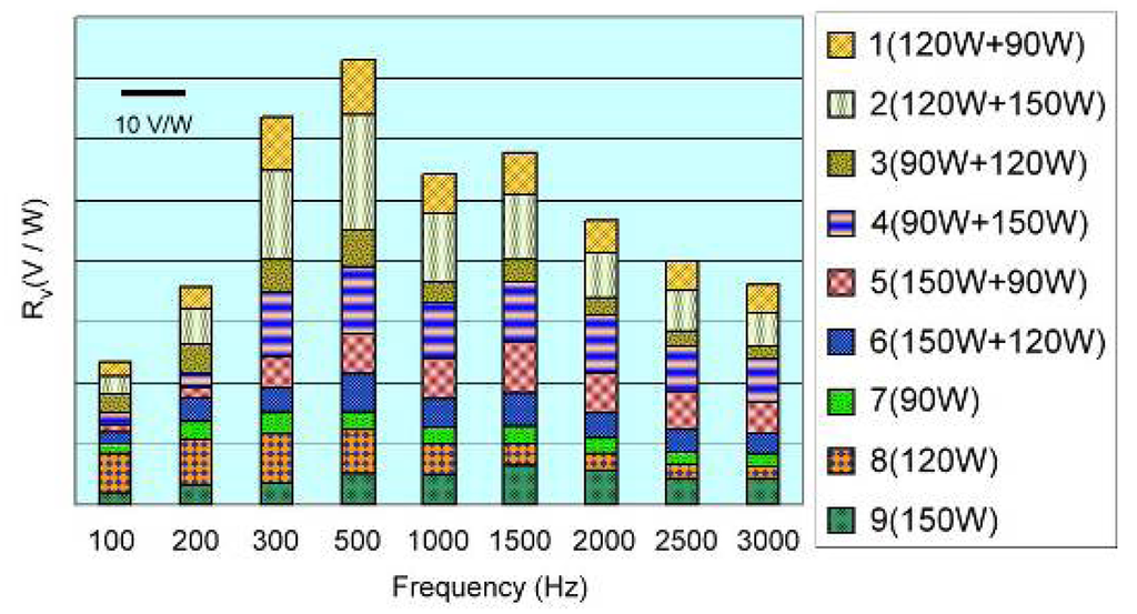 The voltage responsivity of pyroelectric sensor is related to the modulated frequency of pyroelectric sensor [8]. Figure 4 shows the responsivities to modulated frequencies of the test samples under the different sputtering processes listed in Table 1. The responsivity (Rv) is defined as the ratio of the output voltage of the sensor to the input power of the radiation source. Each particular colored bar in Figure 4 corresponds to one of the nine test sample groups listed in Table 1. The height of each colored bar represents the responsivity of the sensor under a particular sputtering process. In other words, the higher the colored bar is, the larger the responsivity is. Obviously, the two-step sputtering processes with a lower-power step followed by a higher-power step can significantly improve the responsivity of the ZnO pyroelectric sensor. Sample 2 (120W+150W) reveals the highest responsivity among the nine test sample groups. For the lower RF power step, the lower deposition rate can obtain finer grains. After the lower power step, the faster deposition rate of the higher RF power step can obtain strongly preferred columnar grains and eventually results in fine columnar grain structures. For the single-step sputtering processes (samples 7 to 9), Sample 8 with RF power of 120 W reveals the highest responsitivity among the three single-step sputtering processes. The responsivity of Sample 2 is about 2 to 4 times than that of Sample 8. Though the two-step power processes with a higher power step followed by a lower power step can also improve the responsivity, the improvements are insignificant.