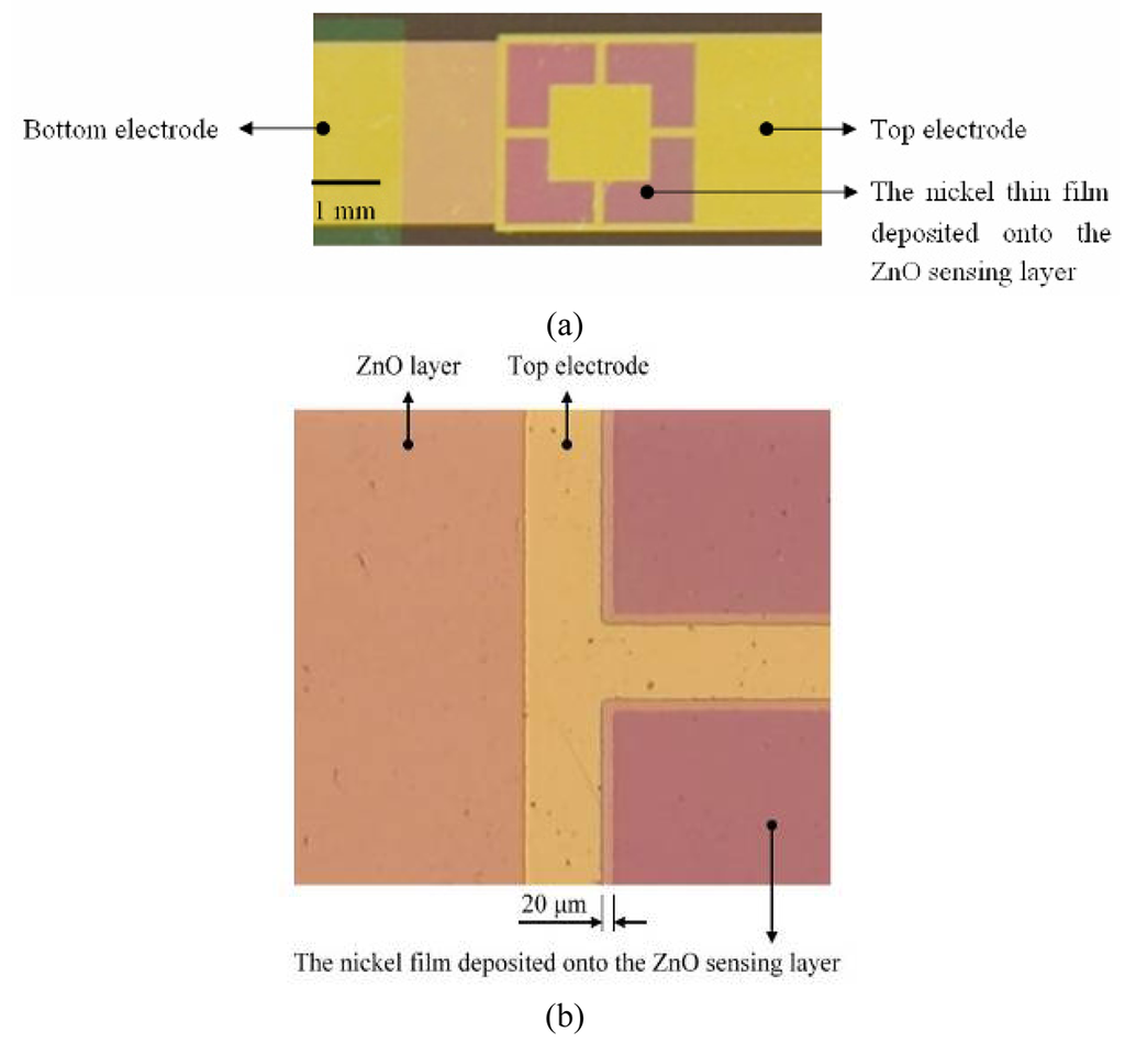 The finished ZnO pyroelectric sensor with 10 nm thick Ni layer deposited onto the ZnO sensing layer, (a) optical microscope with low magnification, and (b) optical microscope with high magnification.