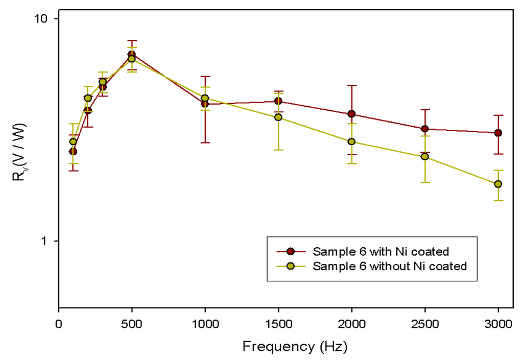 We further deposit the nickel layers of thickness of 10 nm onto the uncovered parts of the ZnO layer, as shown in Figure 5. It should be mentioned that a gap of 20 μm, as shown in Figure 5(b), between the nickel layers and the top electrodes is required to prevent the increasing of resistance. The resistance of nickel is larger than that of gold. If the top electrodes contact with the nickel films, then the resulting resistance of the top electrodes will increase. Therefore, a gap between the nickel layers and the top electrodes is required to prevent the increasing of resistance. The nickel layer can enhance the radiation absorption and therefore improve the sensing performance. As shown in Figure 6, the enhanced nickel layer significantly improves the responsivity of the ZnO pyroelectric sensor for a higher modulated frequency. In general, the voltage responsivity of pyroelectric sensors will decline as the modulated frequencies increase. Therefore, one can use the nickel layer to enhance the energy absorption and thus reduce the decline of voltage responsivity at higher frequencies.