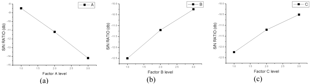 Table 5 shows the S/N ratio responses. For factor A, Table 5 shows the calculated average values of the S/N ratio responses when the levels of feedrate are 1, 2, and 3. Similarly, Table 6 and Table 7 show A*B and A*C interaction matrices, respectively. On the basis of the experimental results, the S/N ratio responses are calculated as shown in Figure 4. Based on these responses, the average values of the thrusts are arranged according to the levels of all factors, and the sums and average values of characteristic dispersions resulting from the level variance of the factors are described in Table 8.