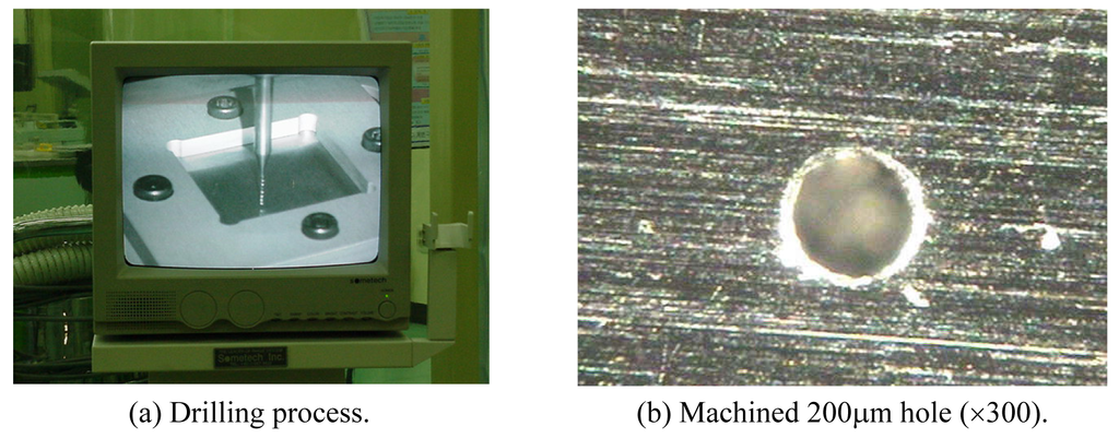 The process of ignoring a factor if it is deemed insignificant, called pooling, is done by combining the measure of influence of the factor with that of the error term. Finally, on the bases of the S/N ratio graphs and ANOVA, it can be declared that A1, B3, and C3 correspond to the factors producing minimal drilling thrusts and there are no interactions between A*B and A*C. Figure 9 shows the actual micro drilling process and a 200μm hole drilled based on the applied methods.