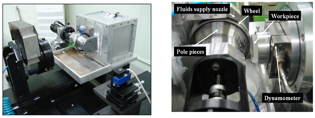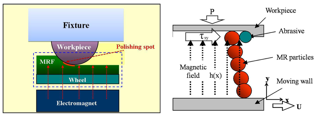 MR fluids are suspensions of very small magnetic additives, such as carbonyl iron (CI), and non-magnetic fluids such as mineral oils or water. MR fluids are known as controllable smart materials, since their flow properties, such as viscosity and stiffness, can be easily changed using externally imposed magnetic fields. Under imposed magnetic fields, MR fluids can be reversibly transformed from a fluid-like state to a solid-like state within milliseconds due to the formation of chain clusters of magnetic particles in the fluids.[3,4] These special characteristics of MR fluids can be applied to polishing processes of micro shapes or parts. MR fluids can produce high stress and pressure on the workpiece surface, based on Bingham lubrication theory and the Preston equation.[5] In the MR finishing process, the surface roughness and material removal rate (MRR) of the workpiece are affected by the process parameters, such as the properties of the employed nonmagnetic abrasives (particle material, size, aspect ratio, density, etc.), rotating wheel speed, imposed magnetic field density, machining depth, etc.