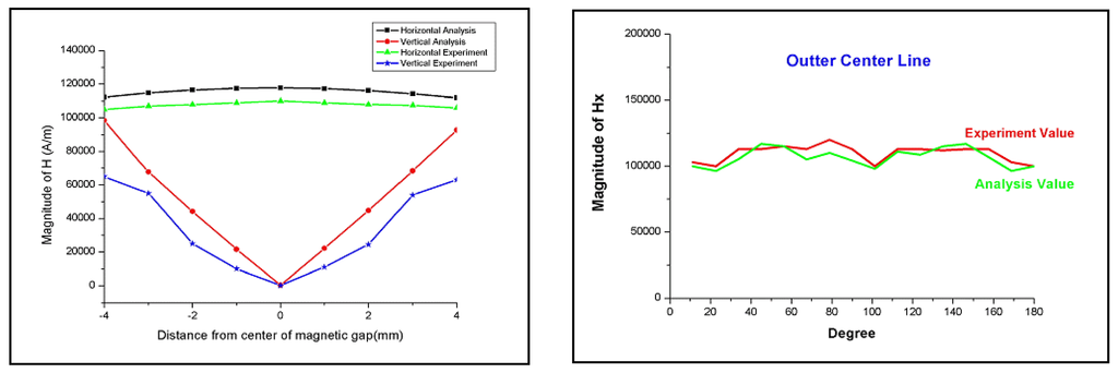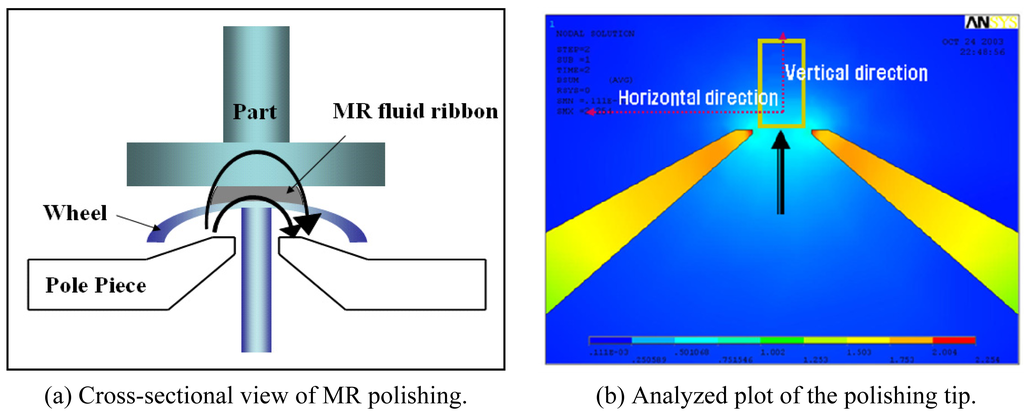 A schematic diagram of the MR polishing mechanism is shown in Figure 2. As shown here, the MR fluid is supplied to the gap between a workpiece and a moving wall (a vertically rotating wheel in this study). When the MR fluid is influenced by the applied magnetic field, the viscosity and stiffness of the fluid increase by more than several tens of times within milliseconds; the fluid then becomes a Bingham plastic fluid.[8] Thus, the MR fluid can rotate continuously as long as it adheres to the wheel surface by the applied magnetic field. For polishing purposes, an abrasive slurry (mixture of DI water and abrasive particles) is incorporated into the fluid, which is supplied to the narrow gap between the wheel and workpiece. At this point in the process, the abrasive particles (generally, nonmagnetic materials) are restricted to the upper part of the MR fluid, so that they can polish the surface of the workpiece. Here, the field of interest is the zone of the magnetic field, where polishing is to be carried out. Figure 3(a) shows an illustration of a cross-sectional view of this zone, and the box in Figure 3(b) denotes the polishing zone. Figure 4 shows the analyzed and measured magnetic field intensity along vertical and horizontal directions at the polishing zone shown in Figure 3(b). From the figures it can be seen that the central part between the pole pieces forms a strong magnetic field by the electromagnetic rolling up coil. Because the magnetic field of the wheel surface is much higher than that at the surface of the nonmagnetic workpiece, the magnetic particles are compressed on the surface of the wheel. Thus, the magnetic particles in the MR fluid push the abrasive particles to the surface of the workpiece, making the polishing process possible.