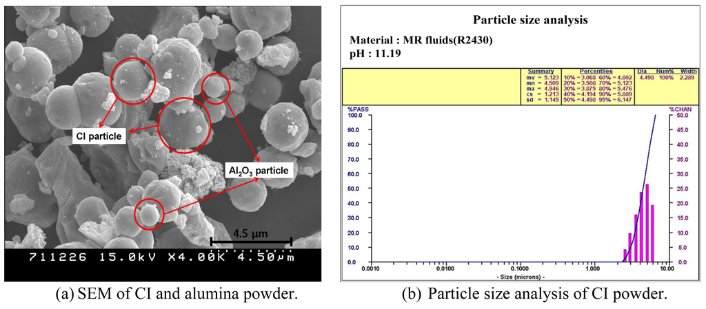 To prepare the required MR fluids for MR polishing, carbonyl iron powder, which is sensitive to magnetic fields, is used. The fluids consist of about 40 vol% magnetic particles, abrasive particles (alumina in this research), and DI-water. A dispersion stabilizer such as glycerol is added to the aforementioned materials as it enhances cohesion of the magnetic fluids and facilitates proper mixing of the polishing slurry and magnetic particles. Photographs of the MR polishing system for the experiments are shown in Figure 5. BK7 glass is used for the workpiece in the basic polishing experiments. The properties of BK7 are listed in Table 1. A SEM photograph and the particle size analysis results are shown in Figure 6. CI powder properties and composition properties of the MR fluid used for experiments are listed in Table 2 and 3, respectively. The experiment is comprised of two basic stages. First, four abrasive slurry conditions are established and compared, as shown in Table 4. Second, the characteristics of polishing spots and material removal rates under different conditions of wheel speed and changes of electric currents are evaluated. For all conditions, the gap between the wheel and workpiece is maintained at 0.8mm, and the slurry supply flow rate is set to 45 ml/sec. Polishing times are set to 20 seconds. Detailed conditions are provided in Table 5.