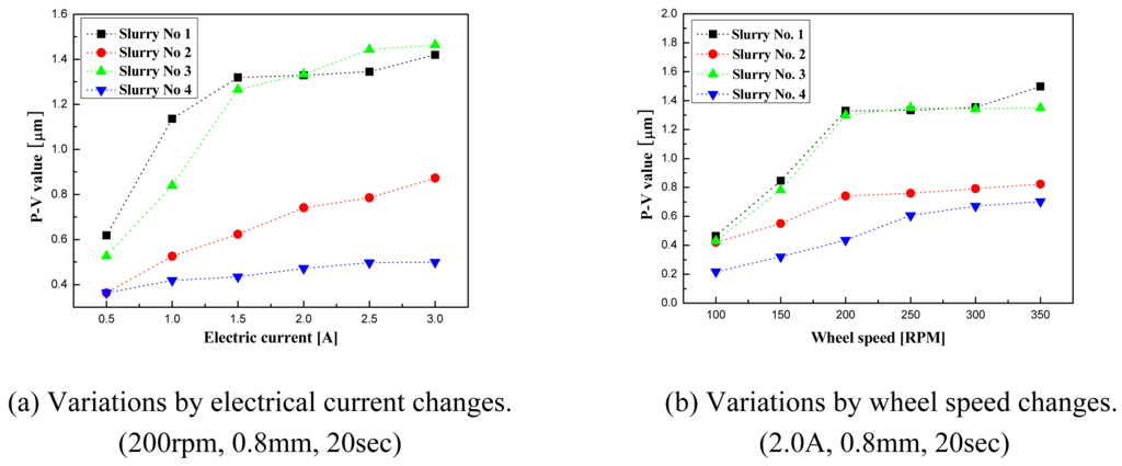 To determine the optimal polishing conditions using the prepared alumina slurries, the material removal rate and surface roughness of the polishing spots are measured by changing the electrical currents and the wheel rotating speeds. Figure 7 shows the summarized results of the variation of the removed depth according to current changes (a), and wheel speed changes (b). It can be seen that the removed depth increases with increased wheel speed and electrical current for all slurries. An increase of electrical current increases the strength of the magnetic field, which leads to an increase in the viscosity of the MR fluids. Thus, the removed depth is also increased, since higher viscosity can generate higher shear forces in the polishing processes. However, it is observed that the rate of increase of removed depth decelerates after a certain level of speed. It appears that an overly high rotational speed may lead to excessive yield stress, which destroys the chain structures among the particles. It could also cause slipping between the wheel surface and MR fluid.