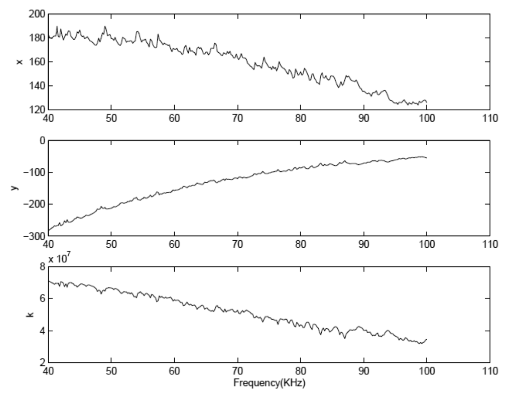 Taking Face 1 of Specimen 1 as an example, the structural mechanical impedance (real part x and imaginary part y) is extracted from the PZT admittance signature, as plotted in Figure 11. A close look at Figure 11 indicates that the dynamic behaviour of this face is similar to that of a system with parallelly connected spring and damper, for which the following relations hold true [28]