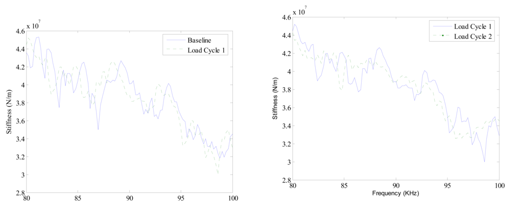 The formulation given in Eqn. (16) has an inherent assumption that does not take into account the type of material being analyzed. Additionally, it is assumed that after the occurrence of damage in the structure, the stiffness at each frequency will reduce with respect to the baseline. Again taking Face 1 of Specimen 1 as an example, it is obvious from Figure 12, the plot of stiffness against frequency that stiffness does not necessarily reduce unilaterally as the load increases. In addition, this trend can be observed in all the three specimens. One reasonable explanation for this could be that the stiffness calculated at different actuation frequencies differs, some more sensitive than other, resulting in non-uniform change of the stiffness values for different load cycles. Thus, a slightly modified version of Eqn. (16) can be given as