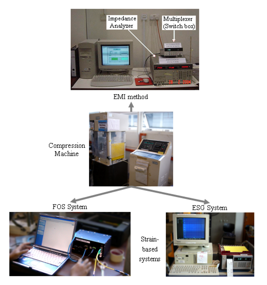 The overall experimental setup is shown in Figure 2, which consists of a compression machine and the EMI, OFS and ESG measurement systems. The EMI system is impedance-based, while the OFS and ESG systems are strain-based. The OFS system consists of an optical spectrum analyzer SM125-500 model [22] which is controlled by a personnel computer (PC). A multiplexed optic fibre is connected to the analyzer and the strain measurements are thus obtained. Another strain measuring system which is based on the ESG sensor is logged by a portable data logger model TDS-302 [23] controlled by a PC to obtain the strain reading at certain predetermined loadings. Lastly, the compression testing and load readout is obtained via a DMG Compression Testing Machine.
